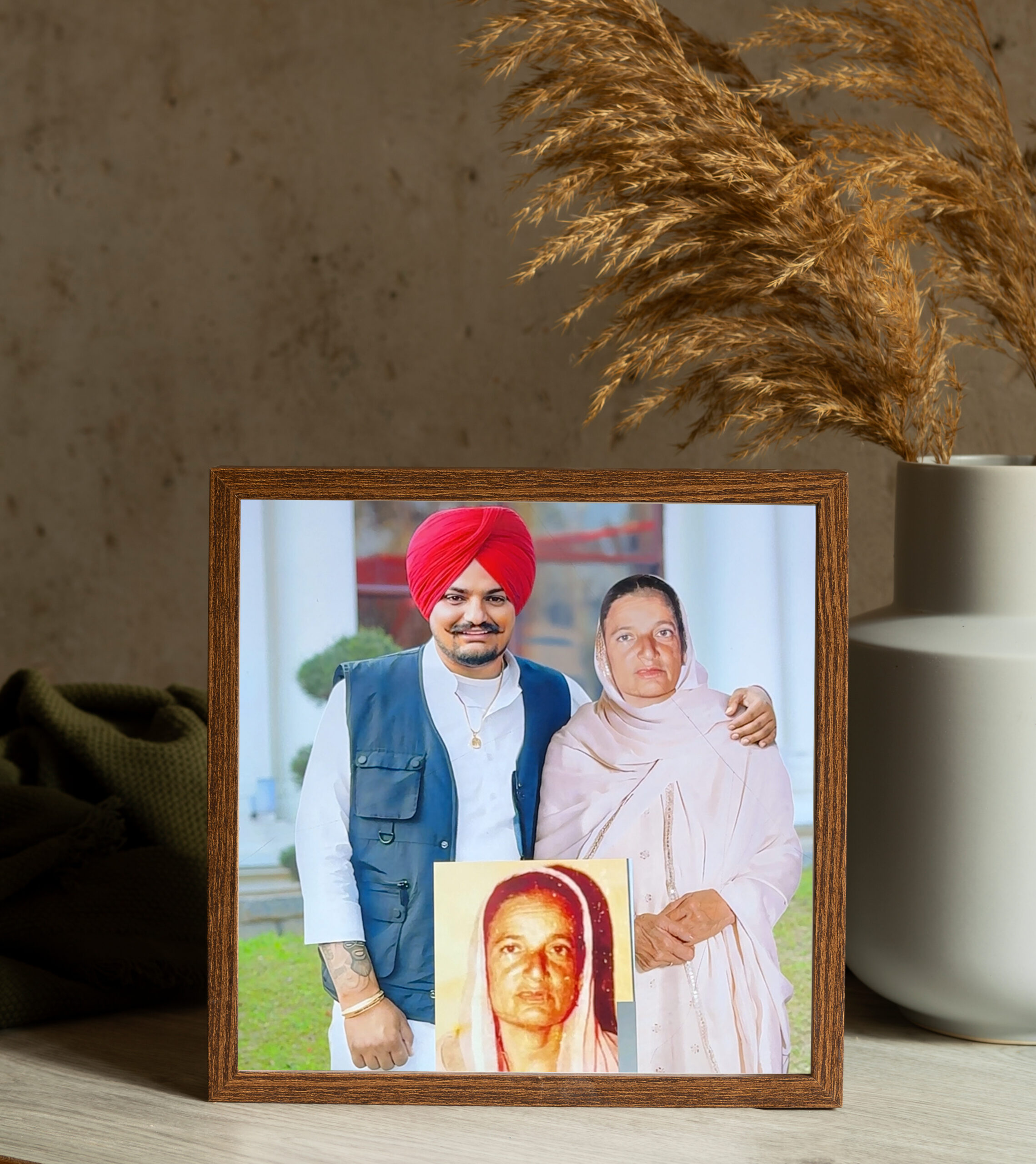 We’ve created a custom portrait of Sidhu Moose Wala with his beloved grandmother, Jaswant Kaur, by seamlessly merging her photograph into one of his recent pictures. This heartfelt artwork brings them together in a single frame, celebrating their eternal bond.
